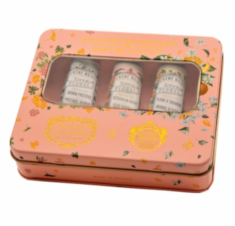 A metal gift box with a sweet and estival design containing three Absolutes hand creams; Orange Blossom, Rose Geranium, Precious Jasmine; to nourish, sooth and protect your hands.